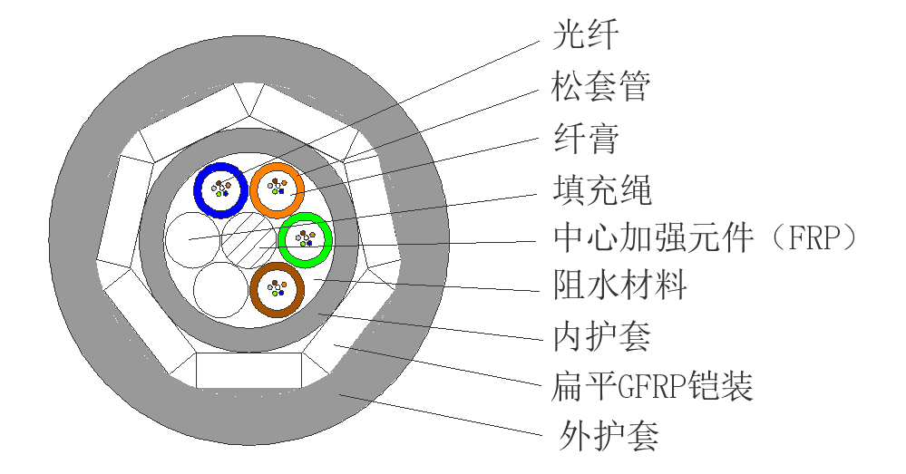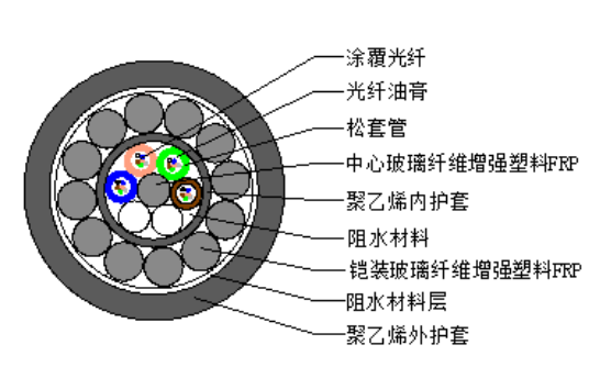 本光纜為全介質(zhì)非金屬結(jié)構(gòu),采用高強度玻璃纖維增強塑料(可選用圓形或扁平GFRP)構(gòu)成極為有效的防松鼠保護層,并通過結(jié)構(gòu)優(yōu)化,實現(xiàn)光纖纜芯微型化和防鼠層重型化,有效的保證了防鼠、防松鼠咬性能。